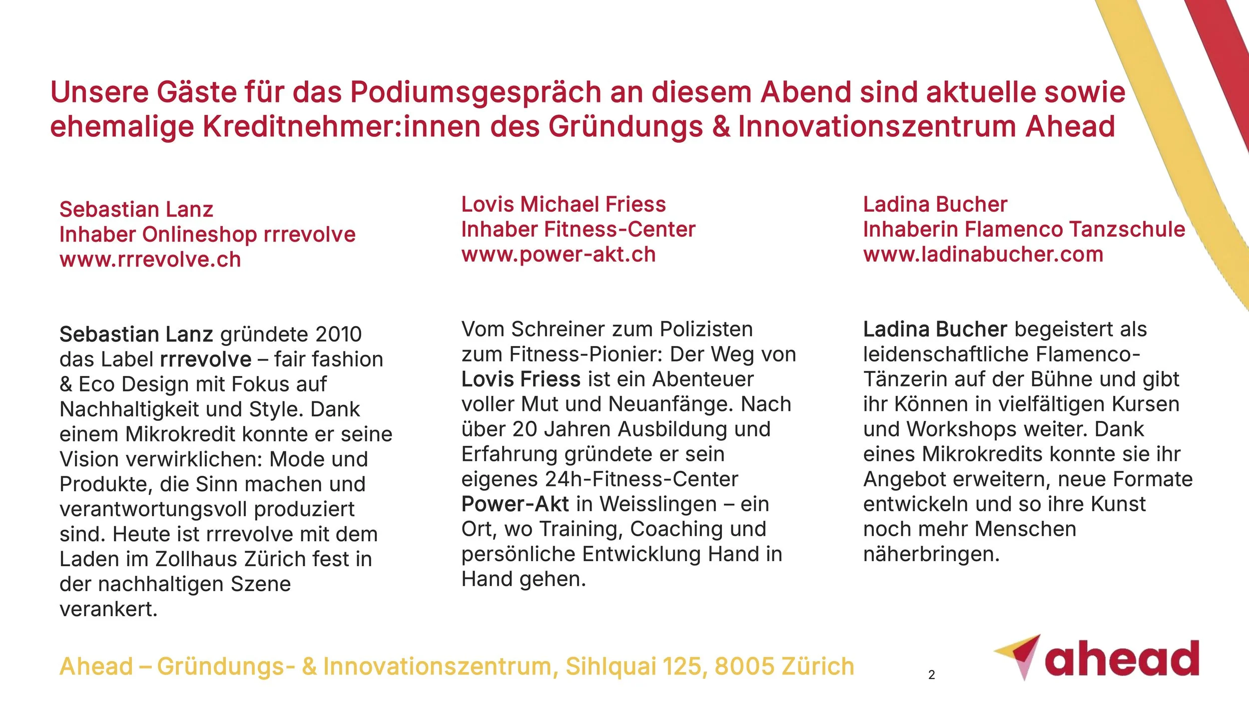 Unsere Gäste für das Podiumsgespräch an diesem Abend sind aktuelle sowie ehemalige Kreditnehmer:innen des Gründungs & Innovationszentrum Ahead